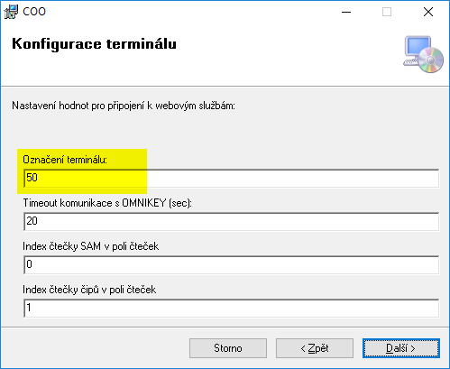 Označení terminálu - označení klientského terminálu, který provádí akreditace. Volitelná hodnota 1 až 100. Je možné měnit při instalaci. Timeout komunikace s OMNIKEY - hodnota v sekundách, určující jak dlouho čeká klientská aplikace na odpověď čtečky. V případě problému se zápisem možno navýšit. Index čtečky SAM v poli čteček - hodnota určující přístup ke čtečce SAM karet. Měnit pouze v případě, kdy ve Workbench je zobrazeno více zařízení než na obrázku. Index čtečky čipů v poli čteček - hodnota určující přístup ke čtečce čipů. Měnit pouze v případě, kdy ve Workbench je zobrazeno více zařízení než na obrázku.