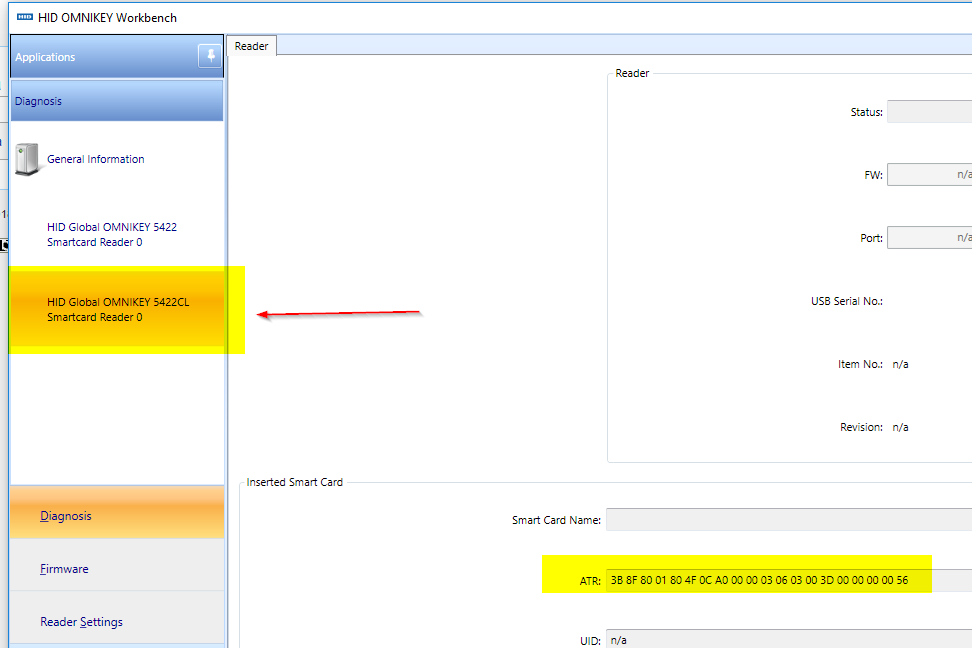 Dalším krokem je připojení čtečky Omnikey do USB počítače. Po jejím připojení spustě nainstalovaný nástroj HID Omnikey Workbench, zástupce by měl být na ploše. Po spuštění zkontrolujte stav čteček. V levé části okna, na otevřené záložce Diagnosis, přejděte na položku General Information. Na ní, v části Found Readers, by měli být vždy dvě položky.